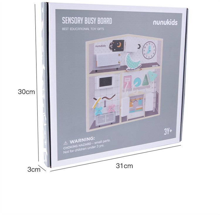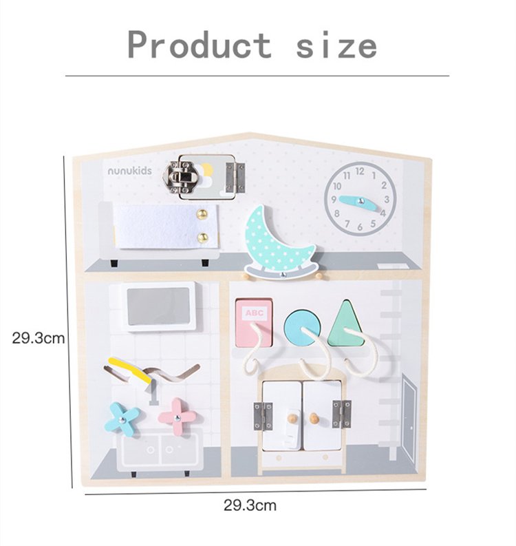 Description: This sensory board with preschool activities will help toddlers to develop their fine motor skills, encourage creativity, develop reasoning skills, problem solving, hand-eye coordination and stimulate imagination. Toddlers will explore house' ''real-life'' scenery and play in a safe environment with this Montessori busy board. They will develop their logic, memory, independence and more. Due to the 12 elements of the busy board, the toddler will train their finger grip, turning movements and will learn how to control their hands.
